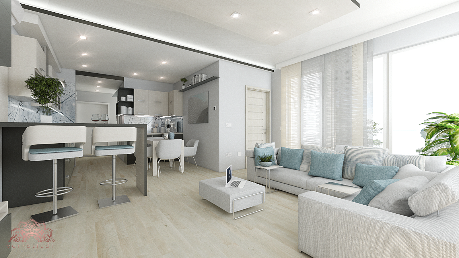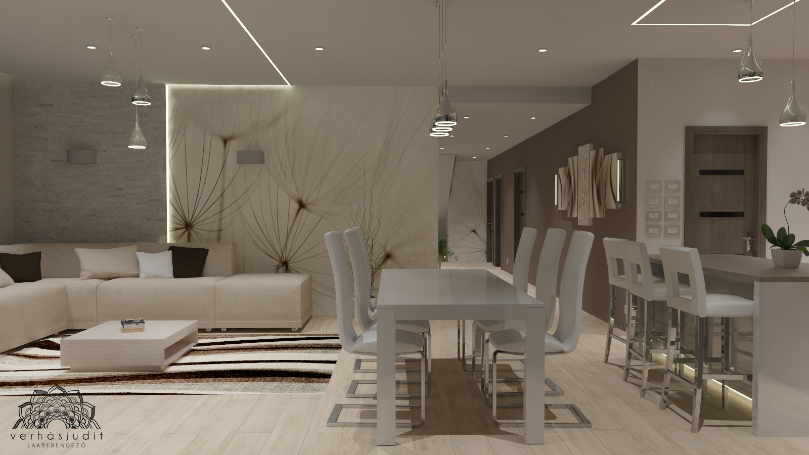 Megrendelőm kérésére modern, finom, letisztult, nem túl hivalkodó, mégis egyedi, a pasztell színeket megjelenítő otthon került kialakításra. A már-már extrémnek mondható, Led-világítással keretbe zárt fotótapétával dekorált, egybenyitott nappali-étkező-konyha teszi karakteressé ezt a budapesti otthont.