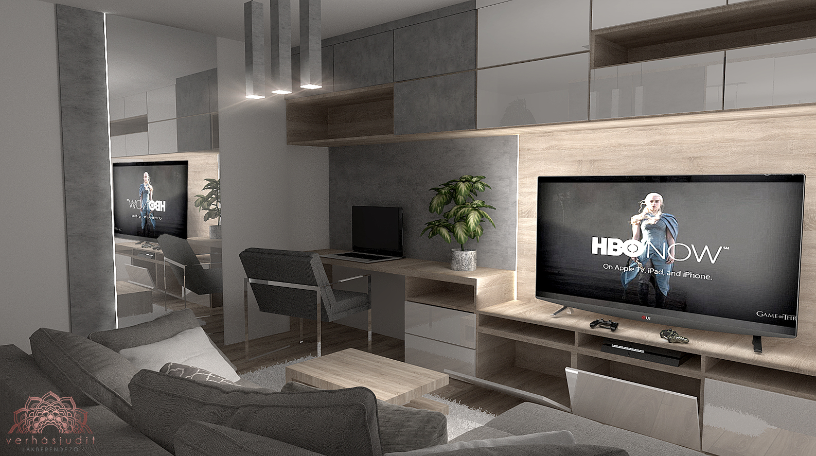 A minimalista, letisztult anyagok képviseletében jelenik meg a magasfényű fehér és beton, melyet otthonossá és meleggé varázsol a natúr tölgy szín. A 19 m²-es nappali, ami egyszerre válhat a család közös esti filmnézéseinek színterévé, dolgozó helyiséggé, Gamer-szentélyé, vendégszobává. Lehetséges? Lehetséges!