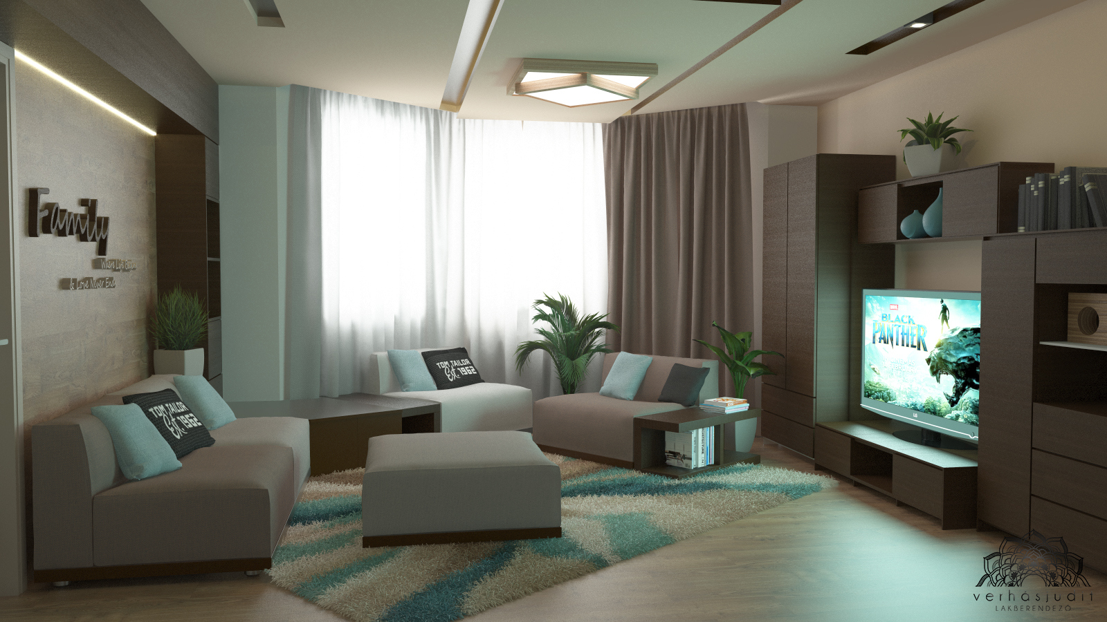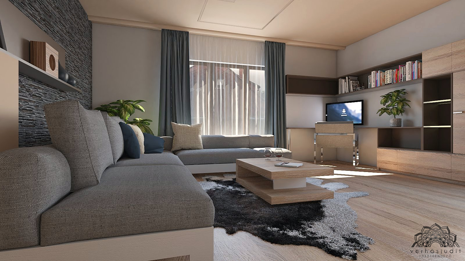 A '80-as évek elején épült és berendezett nappali többféle árnyalatú burkolataiból egyet hagytunk meg (csokibarna) és igazítottuk a modern elképzelésekhez. Az összhangot teljes igénnyel elégítik ki a funkcionálisan elhelyezett lakberendezési tárgyak, bútorok, dekor elemek a föld (barna árnyalatok, kerámiák), a fém (díszkő, fehér/pasztell beige falak), a víz (üvegberakásos szekrények, mélykék kiegészítők, króm asztal- és székláb, gömbölyded díszek), a fa (Sonoma tölgy burkolat, növények, világosabb kék színek) és a tűz (gyertya, állatbőr, embereket ábrázoló képek, ledek) elemek jegyében.